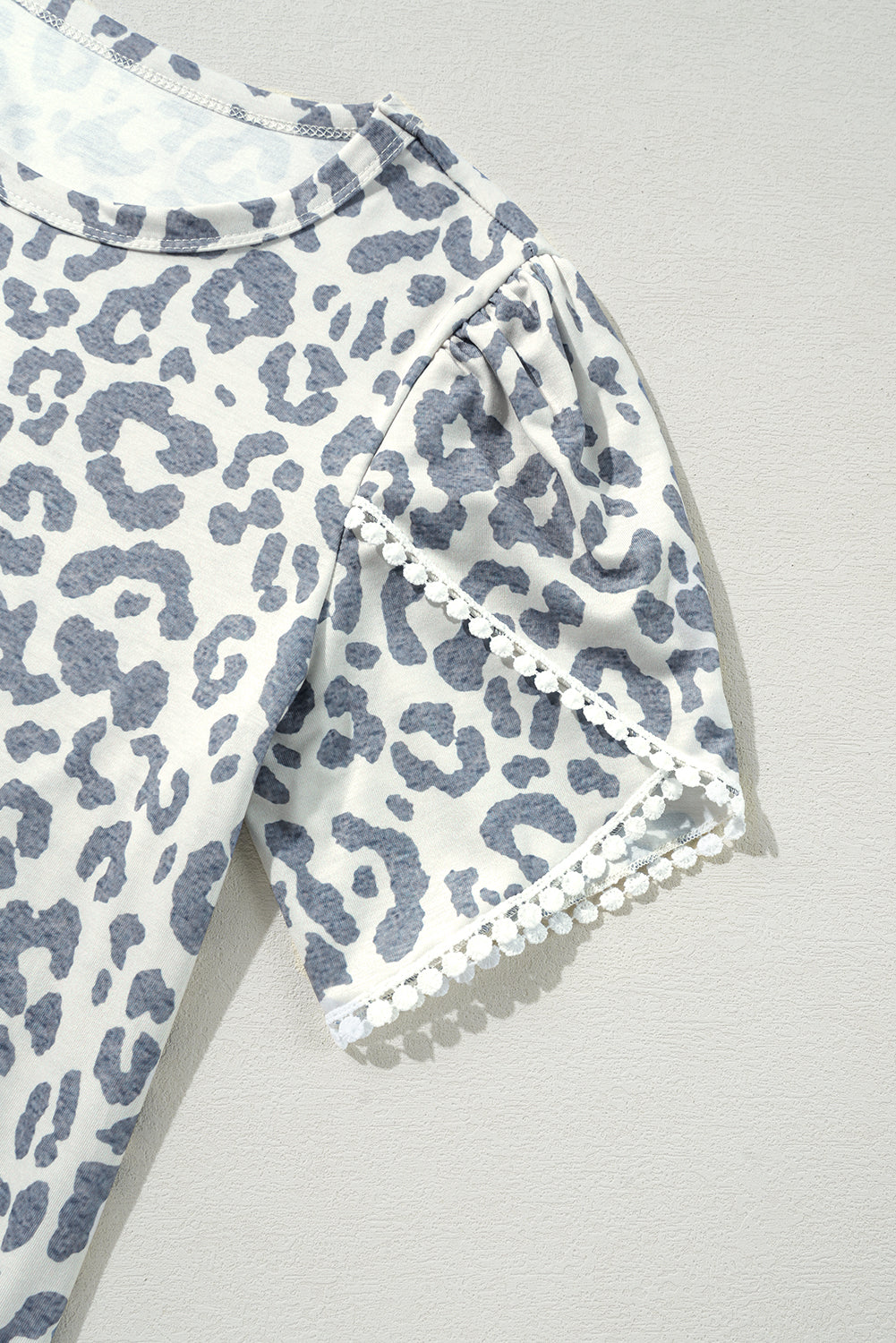 Beige Leopard Round Neck Lace Trim Petal Sleeve T Shirt