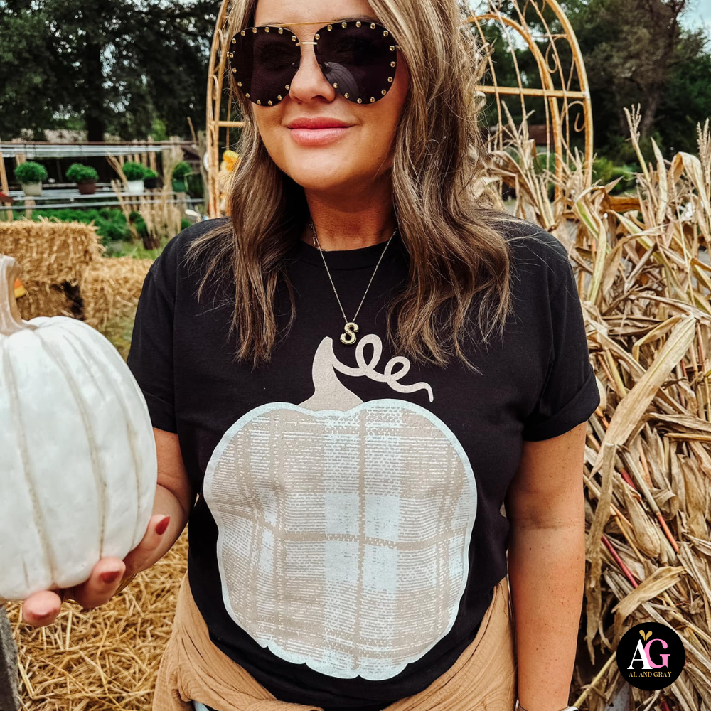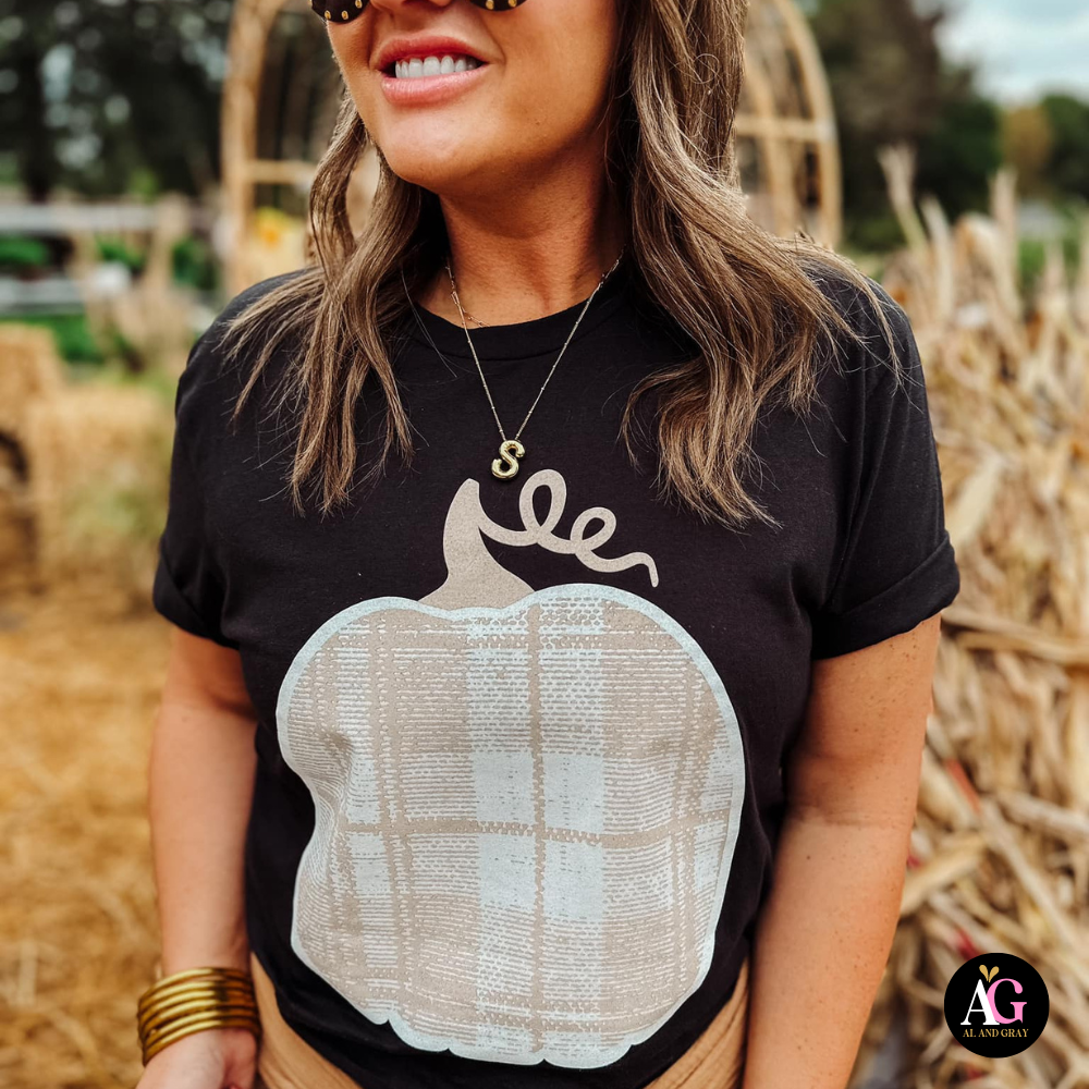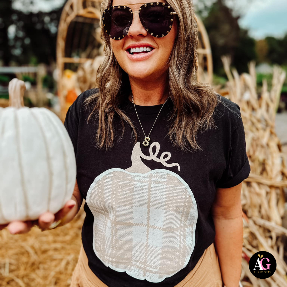 Elevate your fall wardrobe with our Beige Plaid Pumpkin graphic tee. Perfect for adding a touch of autumn to any outfit. Embrace the cozy and charming vibes with this must-have tee!