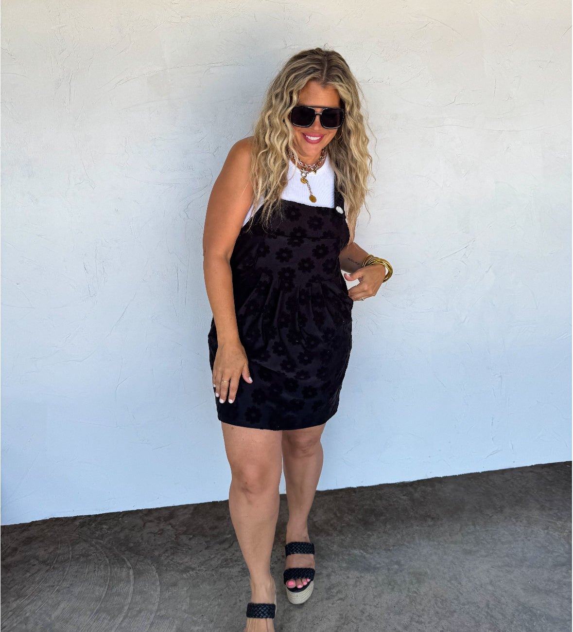 Our most popular style overalls got a makeover and now is in a SKIRT! Features our best selling “daisy” fabric! Laid-back Spring inspired raised terry floral pattern on a soft stretchy fabric! Perfect for warmer weather. Details include oversized side pockets with front pleating and an adjustable button strap for a perfect length (fasten the button up or down to adjust length) complete with a stylish front bib pocket.