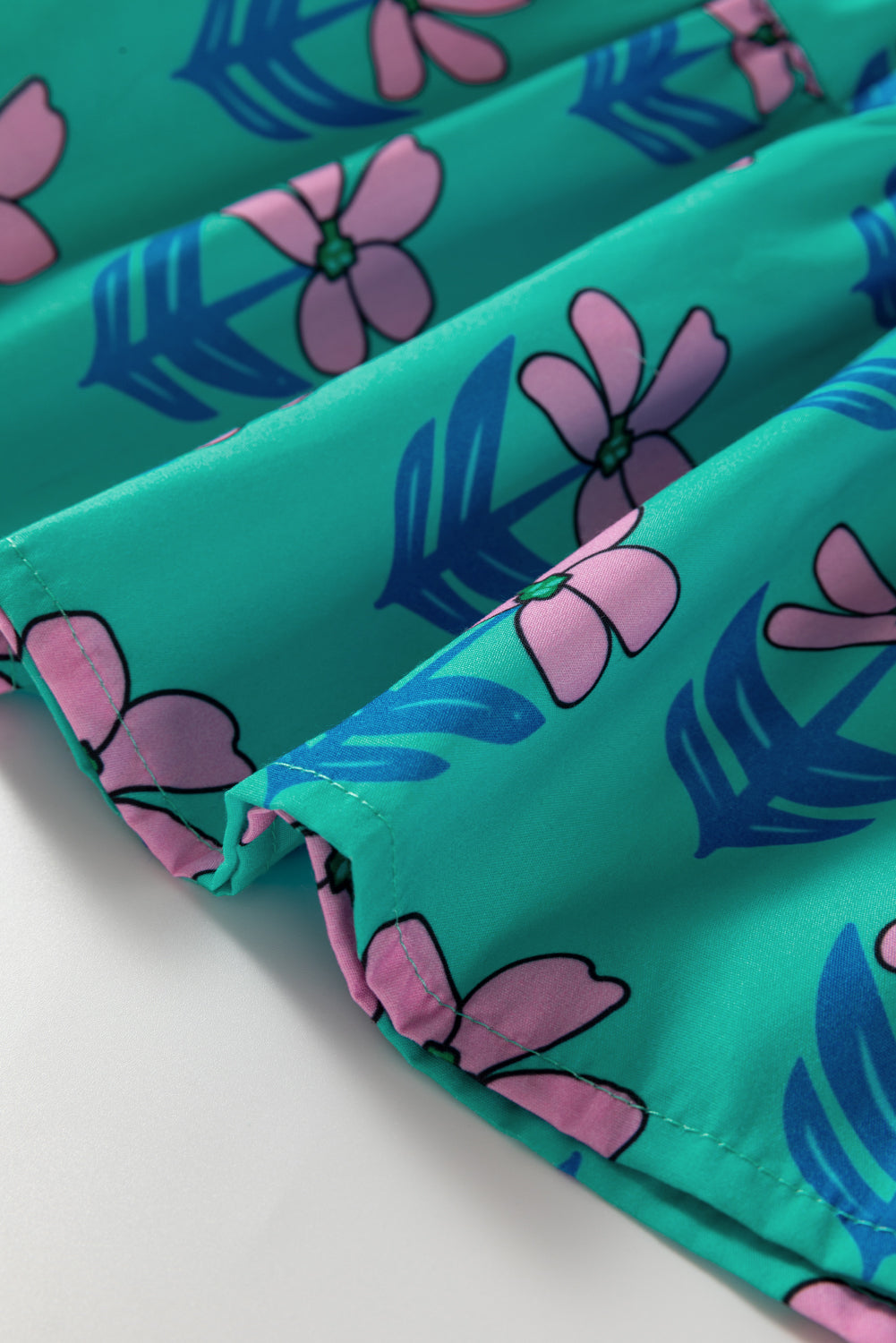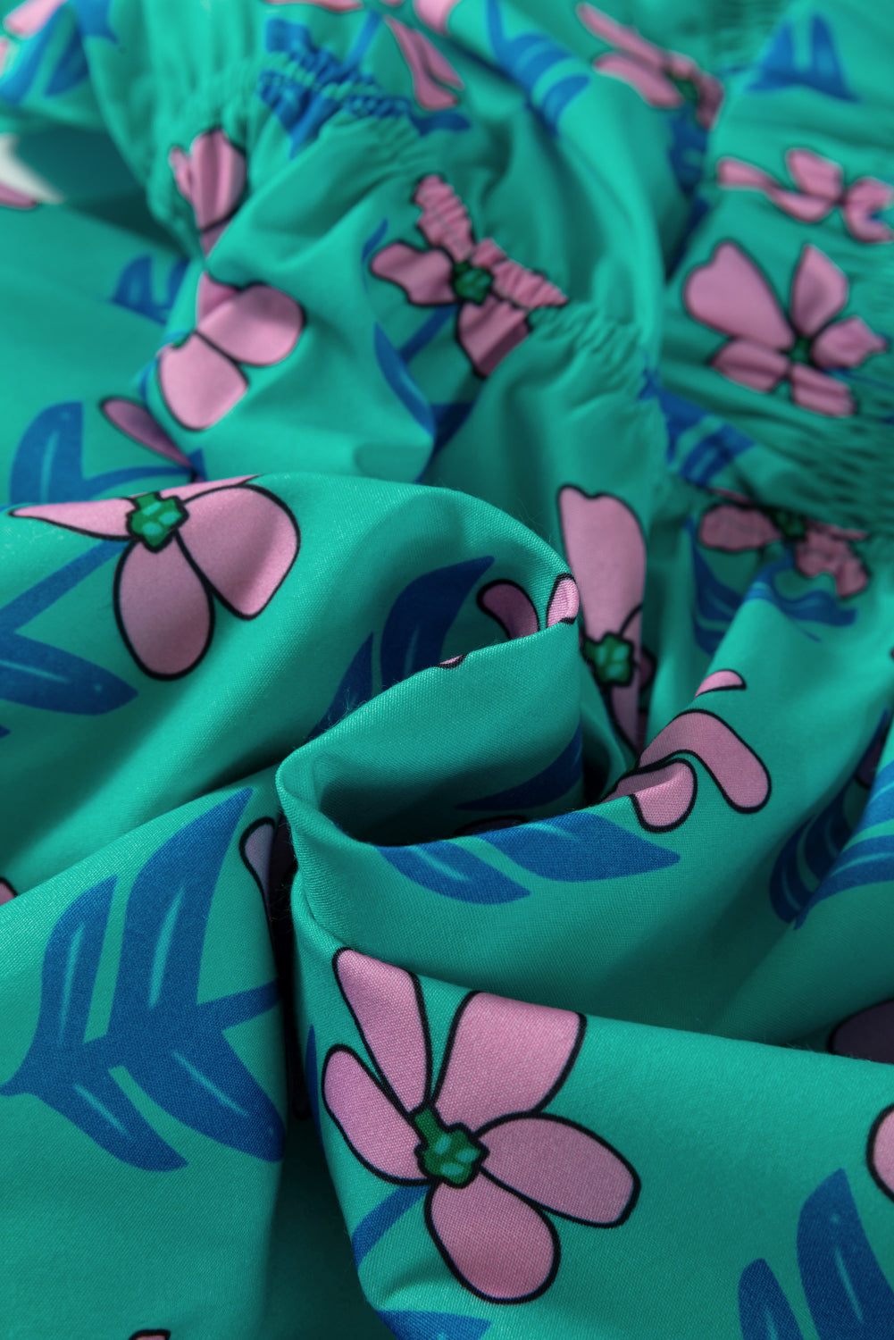 Green Floral Print Frilly Smocked Detail High Waist Mini Dress