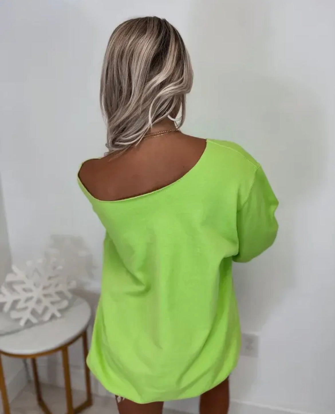 This sweatshirt features an off-shoulder cut with a puff print design, available in sizes Small to 3XL. For a more oversized fit, it is recommended to size up. Please allow approximately 3 weeks for delivery from Friday (9/26).