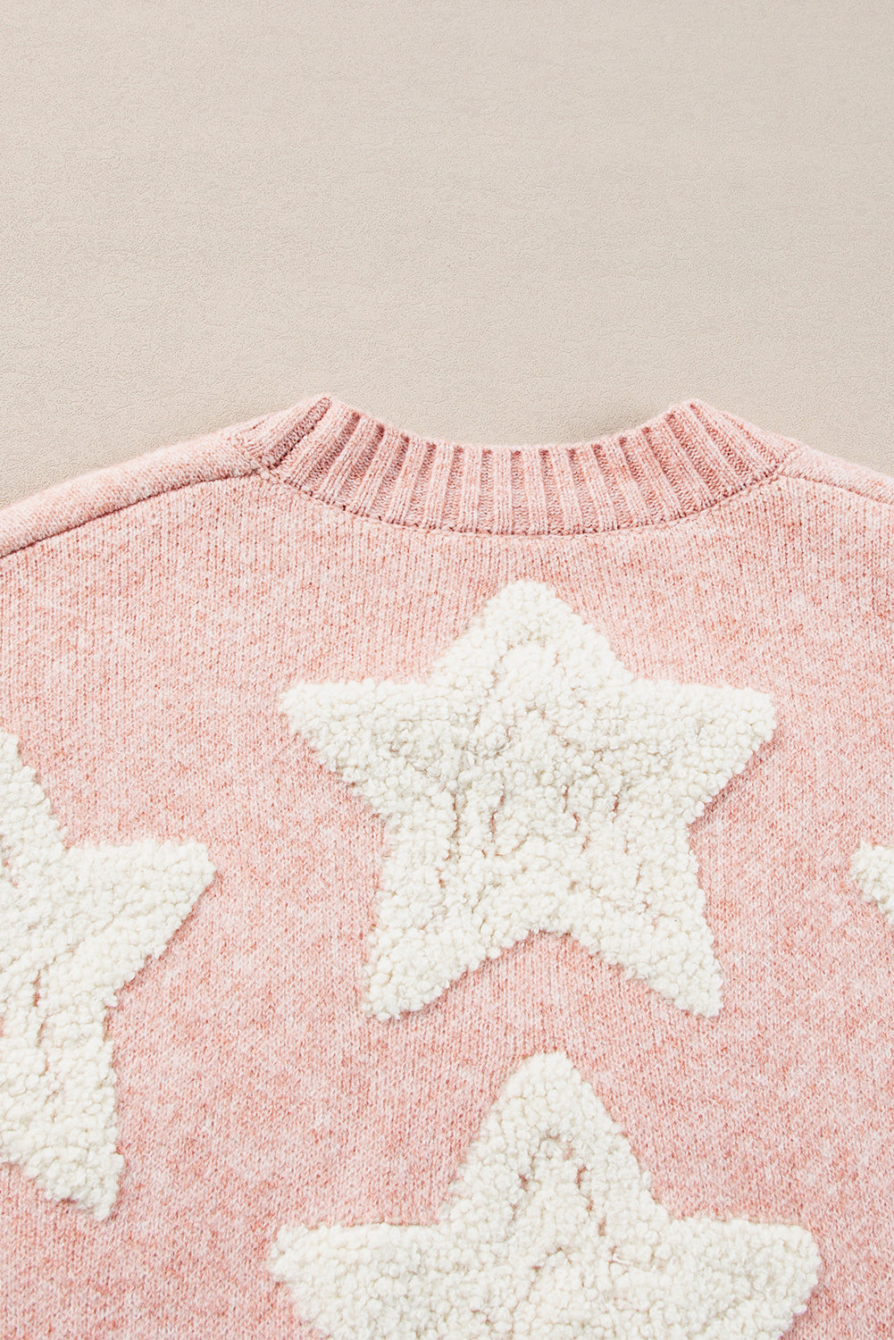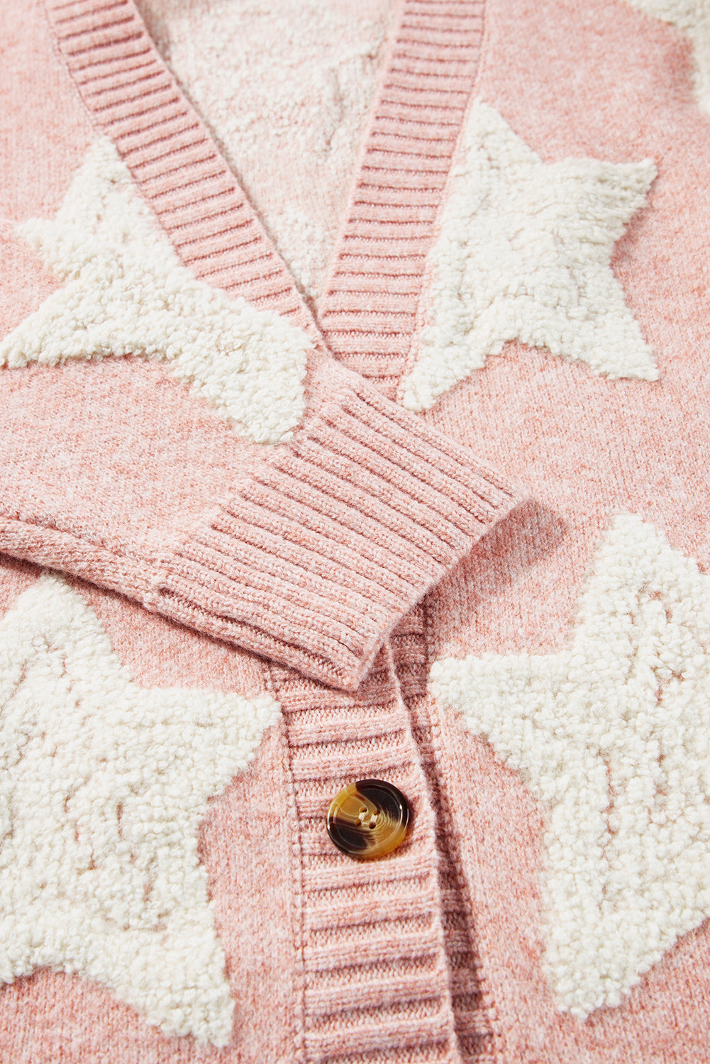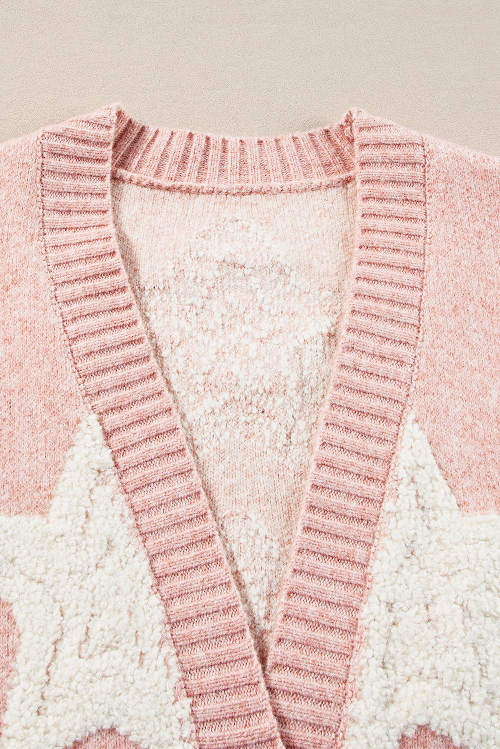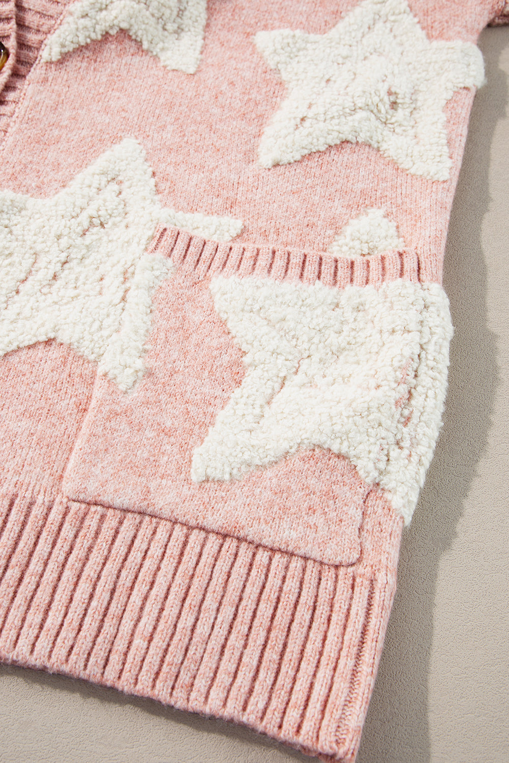 Pink Sherpa Star Pattern Textured Sweater Cardigan with Pockets