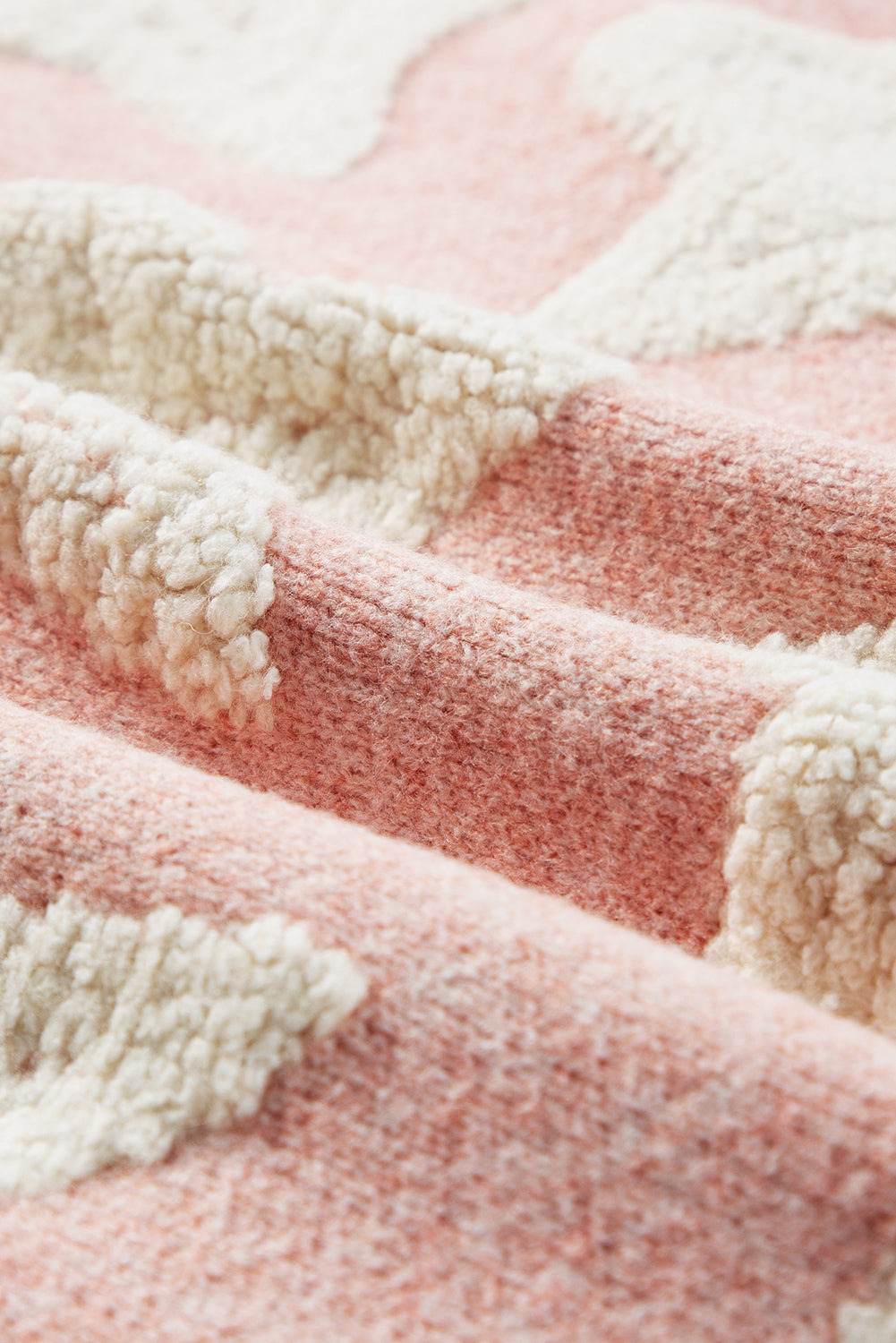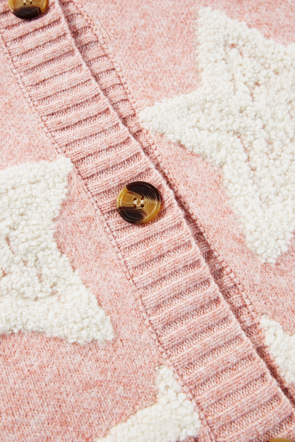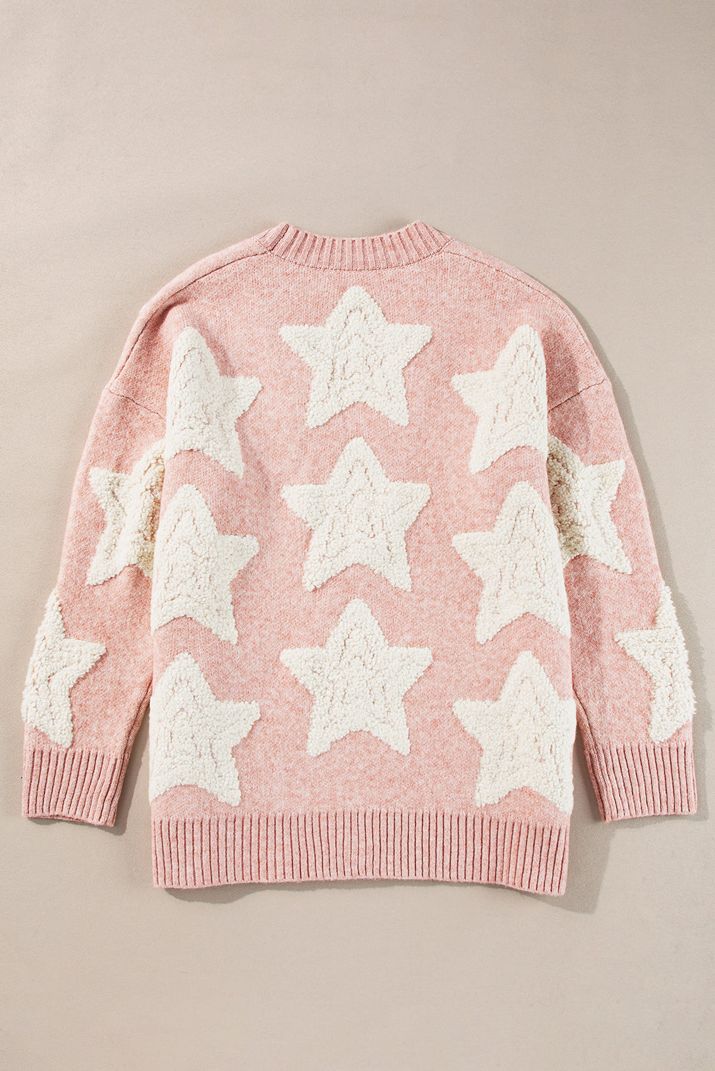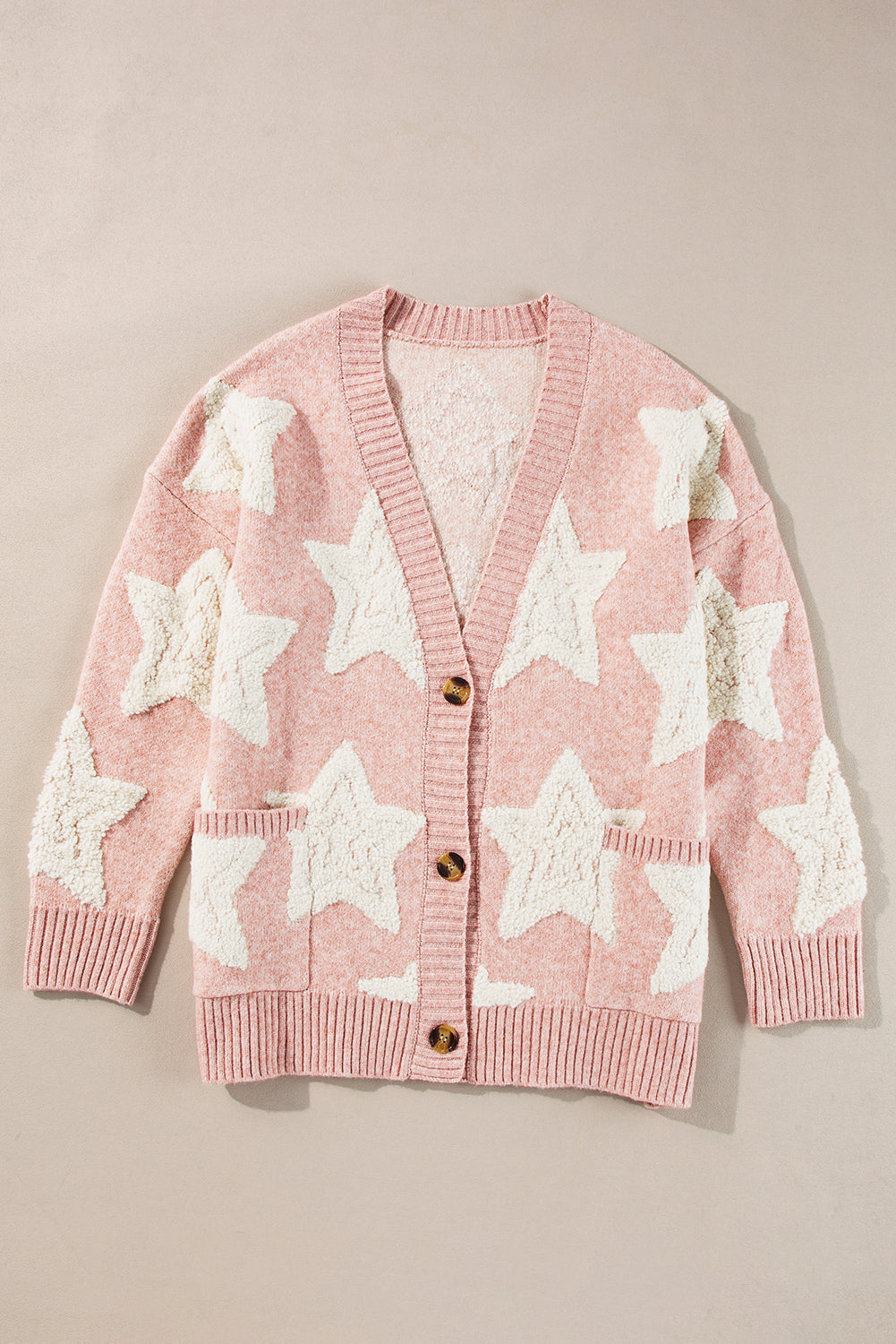 Pink Sherpa Star Pattern Textured Sweater Cardigan with Pockets
