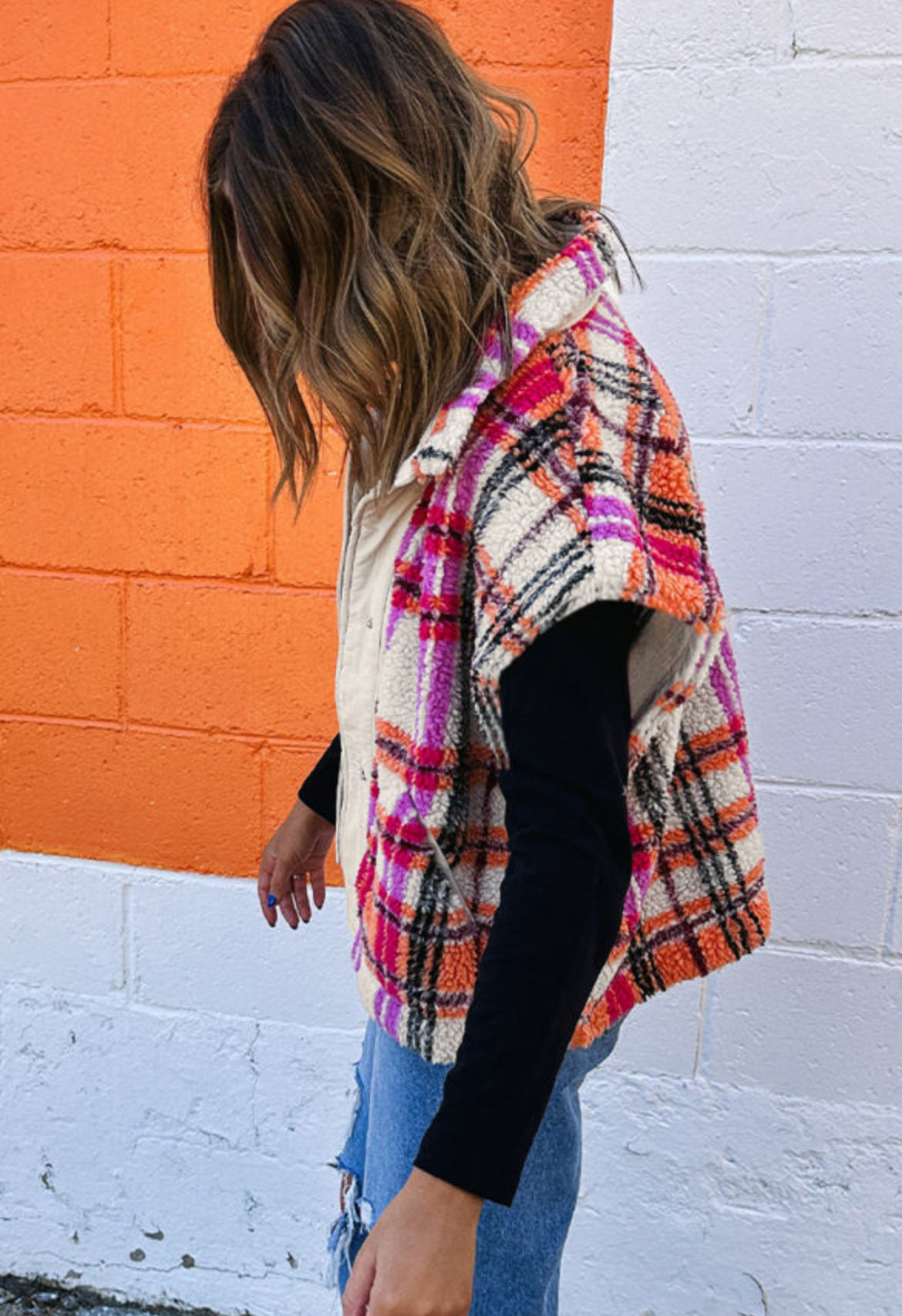 Stay fashionable and warm with our Rose Sherpa Plaid Jacket Vest! Made with cozy sherpa fabric, this vest is perfect for chilly weather. The classic plaid print adds a touch of rustic charm to your outfit. With its sleeveless design and easy zip-up front, it's ideal for effortless layering. Don't miss out on this must-have for your outerwear collection!