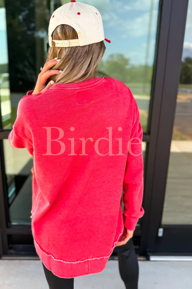 The BIRDIE Red Ash Wash Round Hem Pullover features a unique vintage-inspired wash in a rich red hue for a lived-in, effortless look. Made from soft, comfortable fabric, it’s designed with a flattering round hem and relaxed fit.Â