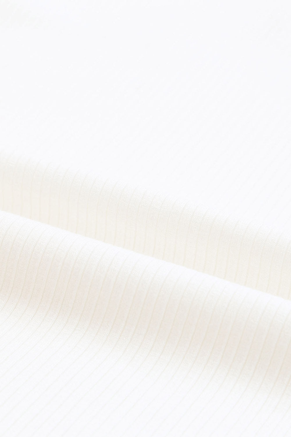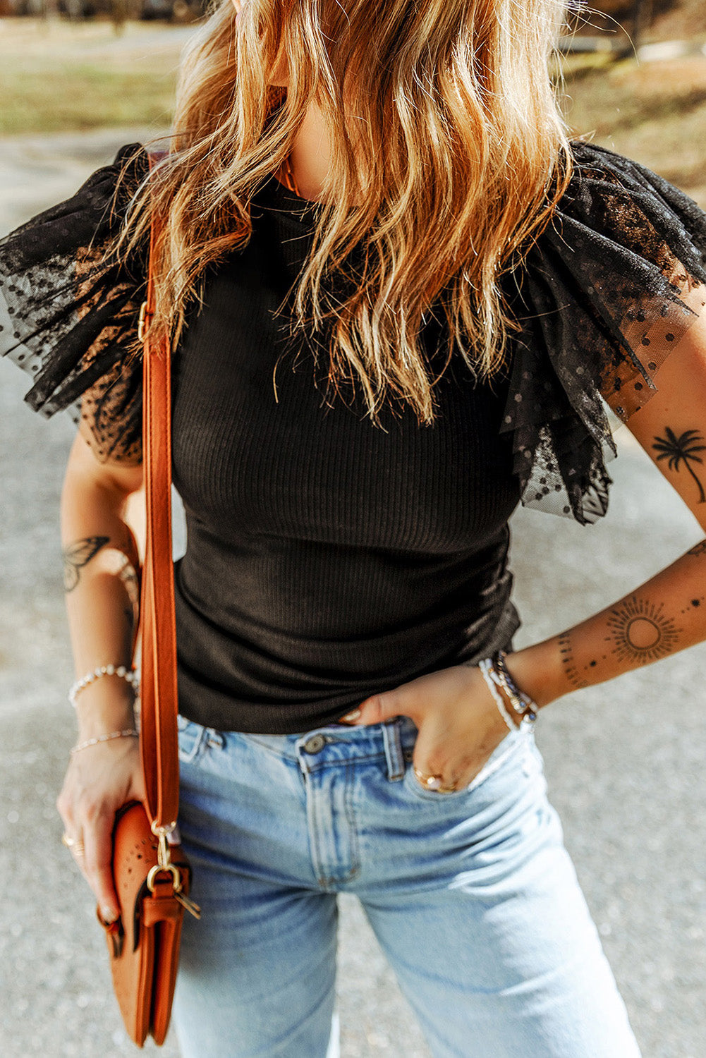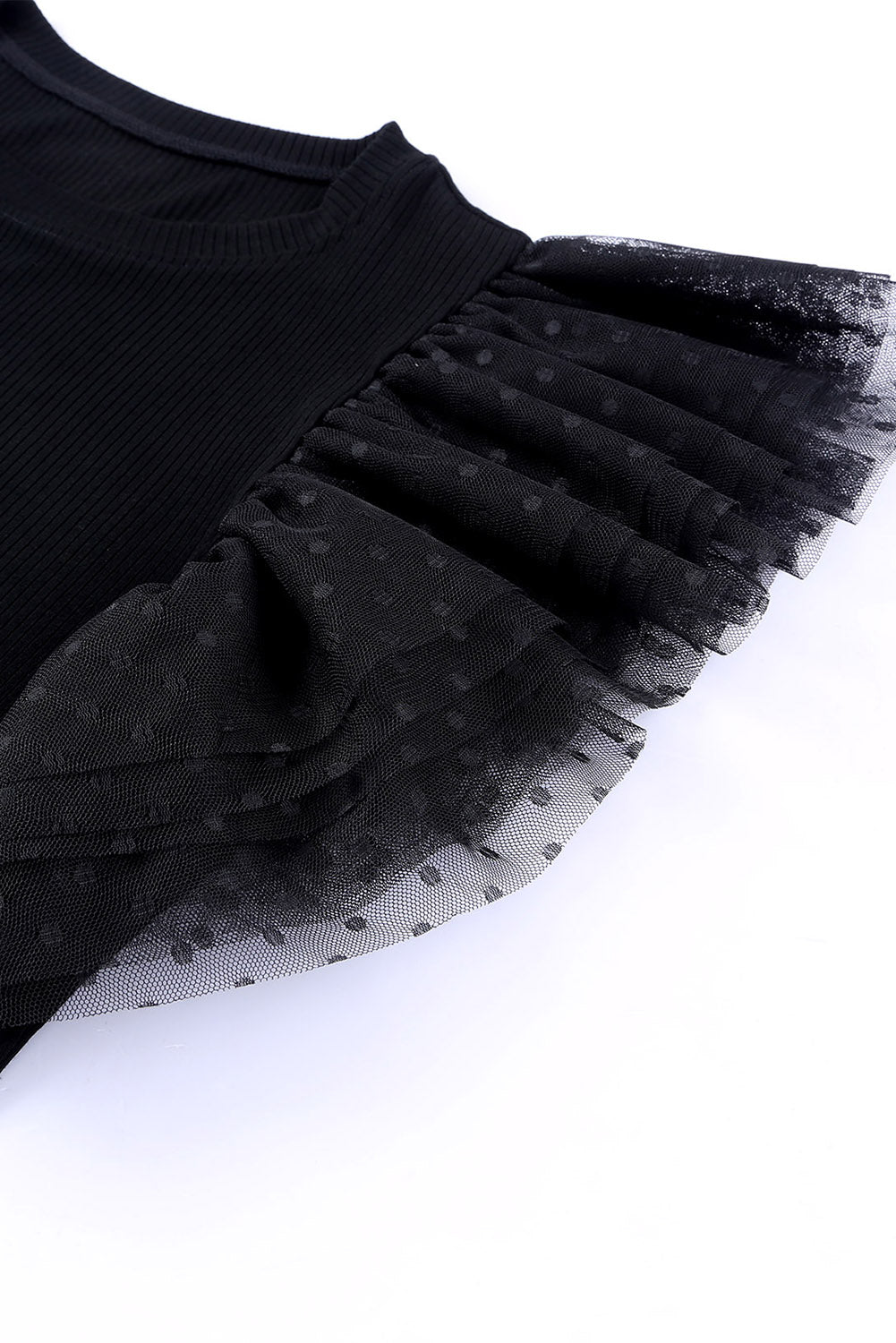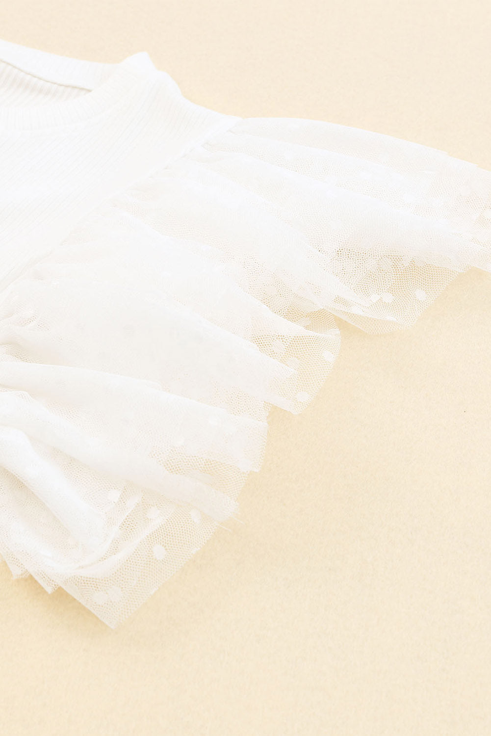 White Dotty Mesh Ruffle Sleeve Ribbed Knit Top